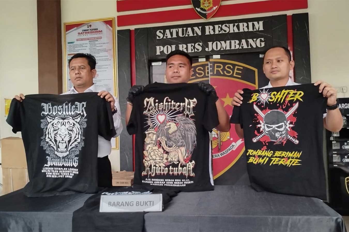 Polisi menunjukkan barang bukti yang diamankan dari insiden bentrok antar pesilat di Jombang. (Foto: IST)
